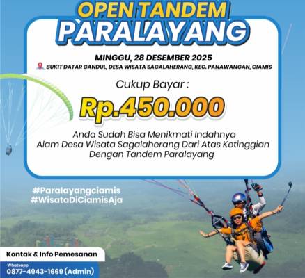 Lebih lanjut Endang menjelaskan pihak penyelenggara, secara resmi telah membuka wisata tandem paralayang pada hari Minggu, 28 Desember 2025 di Bukit Datar Gandul, Desa Wisata Sagalaherang, Kecamatan Panawangan, Ciamis dengan biaya Rp450.000 per orang dengan menghubungi admin di 0877-4943-1869.