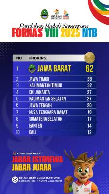 Nurmuttaqin mengungkapkan Selasa 29 Juli 2025 pukul 21.00 WIB, Jawa Barat telah mengoleksi 62 medali, unggul jauh dari provinsi lain dan menduduki peringkat pertama dalam klasemen perolehan medali sementara FORNAS VIII 2025.