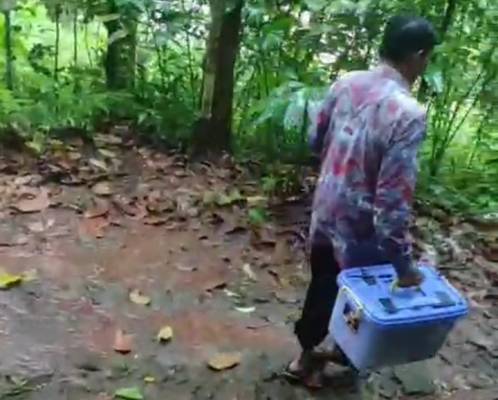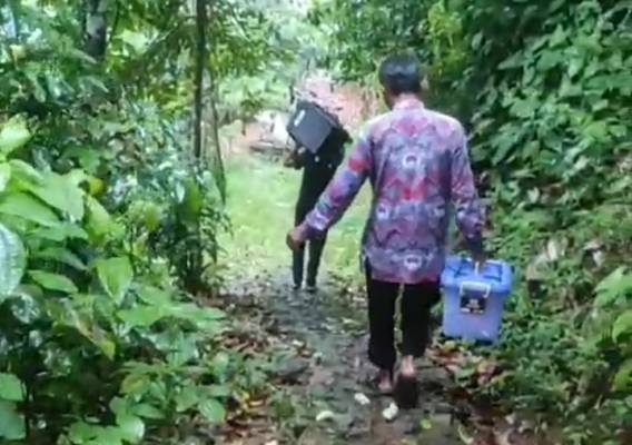 Perjalanan petugas Disdukcapil kali ini tidak mudah. Para tim yang turun ke lokasi dengan berjalan kaki sempat tergelincir di tanjakan berlumpur akibat hujan. Meski cuaca ekstrem dan akses jalan sulit, tim berkomitmen menuntaskan pelayanan hingga malam hari.