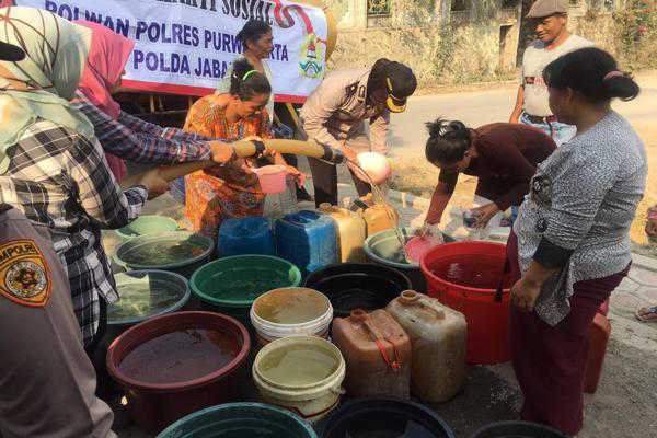 ”Tapi musim kemarau ini air sumur pun mulai surut dan hanya bisa digunakan untuk mencuci dan mandi, tetapi kalau untuk minum dan memasak, kami terpaksa membeli. Kami sangat bersyukur dengan adanya pemberian air bersih dari Polres Purwakarta ini, ini bukti polisi di Purwakarta peduli terhadap masyarakat,” tandasnya.***budy