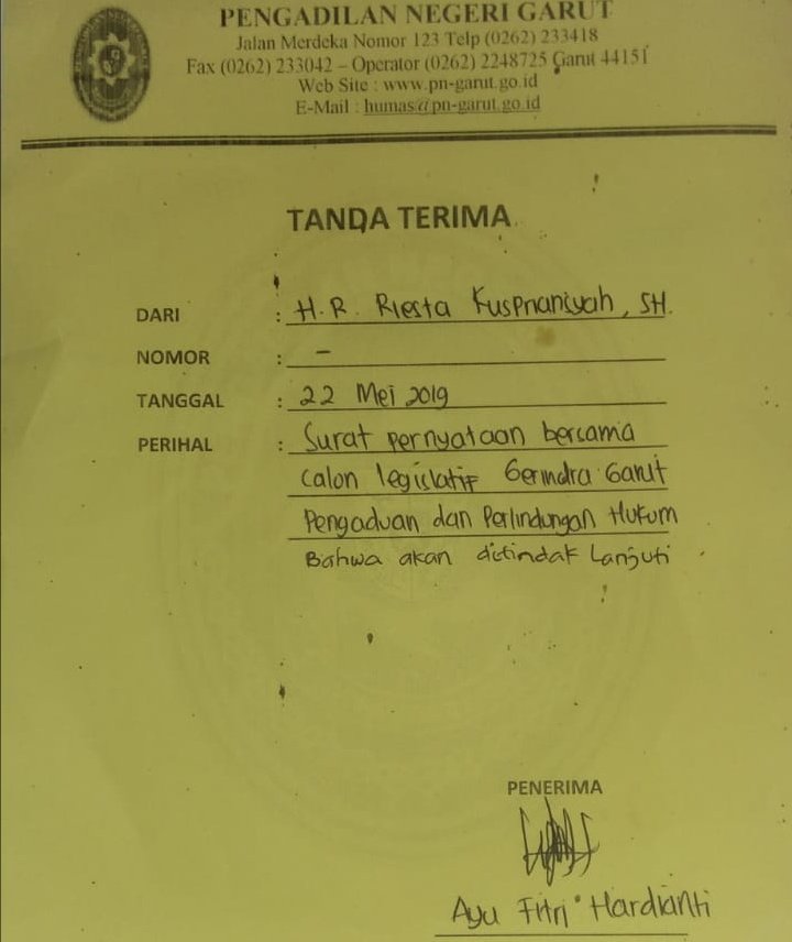 Menurut Riesta, pengaduan tersebut dari para caleg Gerindra DPC Garut atau Forum Caleg Gerindra tertanggal 20 Mei 2019, dan pengaduan tersebut sudah ditindak lanjuti dengan disampaikan pengaduan dari kami ke Pengadilan Negeri Garut Tertanggal 22 Mei 2019.
