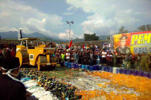 Puluhan ribu minuman keras oplosan dan berbagai merek lainnya dimusnahkan jajaran muspida kabupaten Bandung, di alun alun Cicalengka, Kamis 19 April 2018.