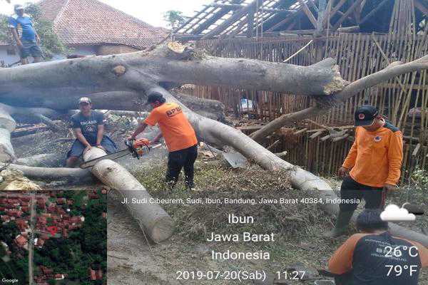 Bpbd Kabupaten Bandung bersama satpol pp Kecamatan Ibun melaksanakan evakuasi pohon tumbang yang jatuh menimpa rumah warga dan kandang ayam serta menghalangi akses jalan sehingga mengganggu aktifitas ekonomi masyarakat. Kejadian tersebut terjadi di RW 08 Desa Sudi Kecamatan Ibun, Sabtu ( 20/7/2019).