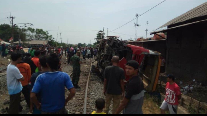 Tabrakan yang terjadi di pintu kereta api warung bambu kecamatan karawang timur yang tidak jauh dari Mapolres Karawang ramai oleh warga yang melihat peristiwa tabrakan kereta api yang melintas dengan Bus Agraas.
