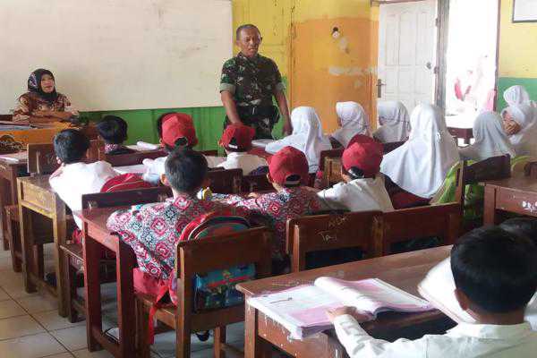 Anggota KODIM 0619/purwakarta PELDA Deni Kurnia Kamis (19/9/2019) saat Bintahwil di lokasi TMMD wawancara dan pemberian materi, wesbang serta tanya jawab dengan anak anak SD 2 Cisaat.