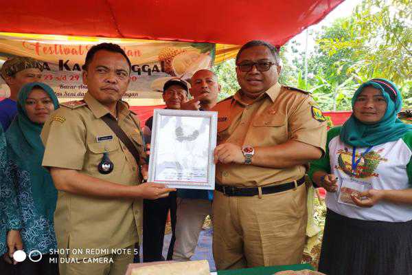 Dejurnal.com, Kab. Sukabumi – Kepala Desa Kadununggal Kecamatan Kalapa Nunggal, Mohamad Yusuf atau lebih di kenal dengan sebutan Kades Bako memberikan cindera mata spesial kepada Bupati Sukabumi H. Marwan Hamami pada acara Festival Durian Kalapa Nunggal, Senin (24/2/2020).