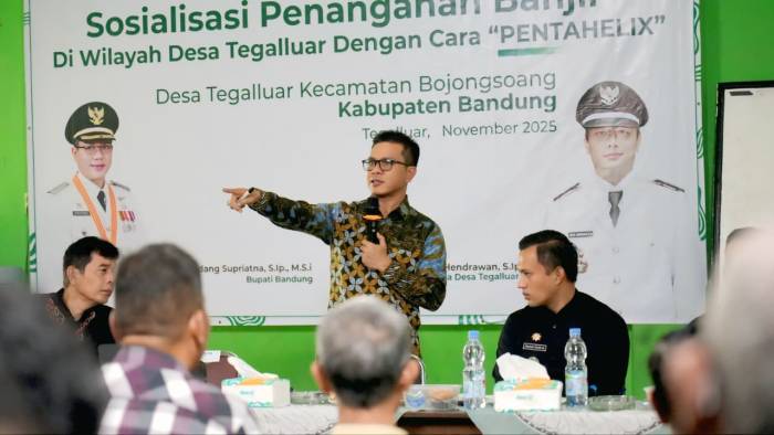 Hal itu ditandaskannya saat Rapat Koordinasi Sinergitas Pentahelix Penanganan Banjir di Wilayah Sapan Tegalluar, di Aula Kantor Desa Tegalluar Kecamatan Bojongsoang, Kamis 27 November 2025.
