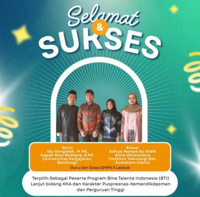 Ciamis, deJurnal,- Dunia pendidikan Kabupaten Ciamis kembali mencatatkan prestasi nasional. Dua guru dan dua siswa SMPN 3 Lakbok terpilih mengikuti Program Bina Talenta Indonesia (BTI) lanjut bidang KKA dan Karakter Puspresnas – Kemendikdasmen yang bekerja sama dengan berbagai perguruan tinggi terbaik di Indonesia.