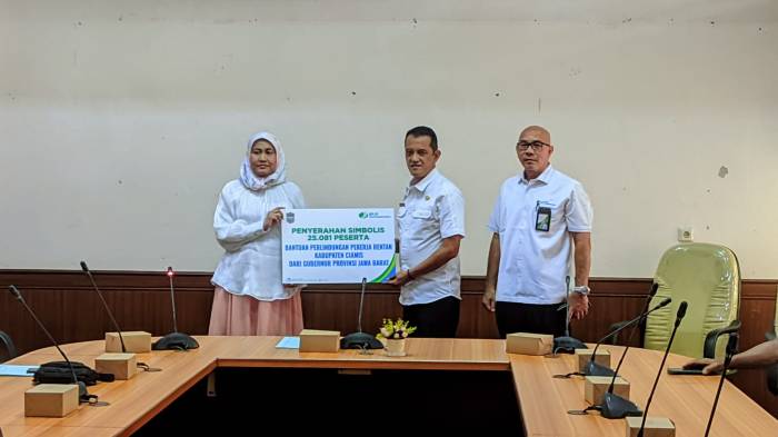 Ciamis, deJurnal,- Pemerintah Kabupaten Ciamis menerima penyerahan simbolis bantuan perlindungan bagi 25.081 pekerja rentan dari Pemerintah Provinsi Jawa Barat dan BPJS Ketenagakerjaan.