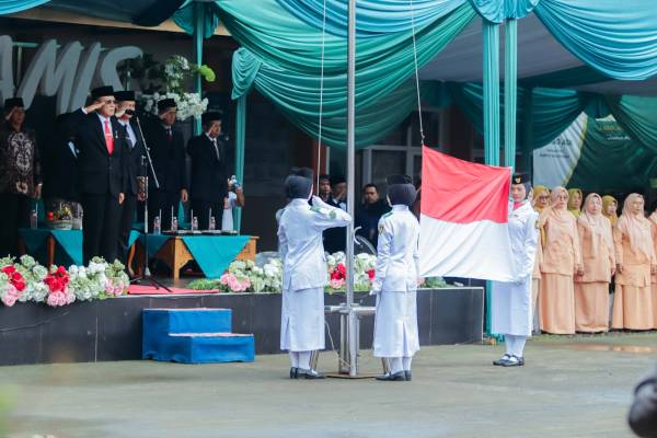 Bertindak sebagai inspektur upacara, Bupati Ciami, Dr. H Herdiat Sunarya membacakan sambutan Menteri Agama RI, Nasaruddin Umar.