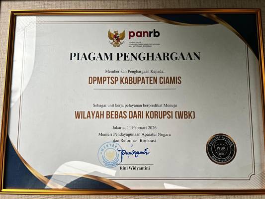 Dinas Penanaman Modal dan Pelayanan Terpadu Satu Pintu (DPMPTSP) Kabupaten Ciamis resmi meraih predikat Wilayah Bebas dari Korupsi (WBK) dari Kementerian Pendayagunaan Aparatur Negara dan Reformasi Birokrasi (KemenPAN-RB), di Kantor KemenPAN-RB, Jakarta. Rabu (11/02/2026).