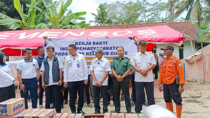 Dipimpin Kasi Binadik dan Giatja, James P. Tampubolon, jajaran petugas bersama 11 warga binaan pemasyarakatan (WBP) turun langsung menyalurkan bantuan sekaligus melakukan kerja bakti di lokasi tanggul jebol di Desa Sukahurip dan Desa Bangunsari, Kecamatan Pamarican, Kabupaten Ciamis, Rabu (18/2/2026).