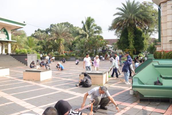 Mereka menyisir area halaman depan, samping, hingga sudut-sudut lingkungan masjid. Sampah dikumpulkan, rumput liar dibersihkan, dan lingkungan dirapikan secara menyeluruh.