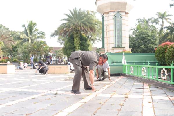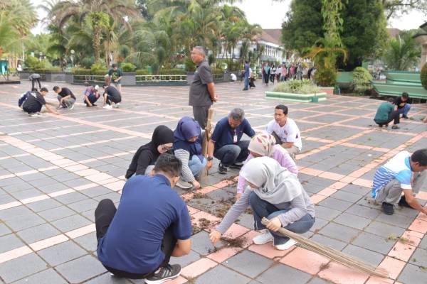 Usai apel pagi, ratusan pegawai Setda langsung bergerak membawa perlengkapan kebersihan.