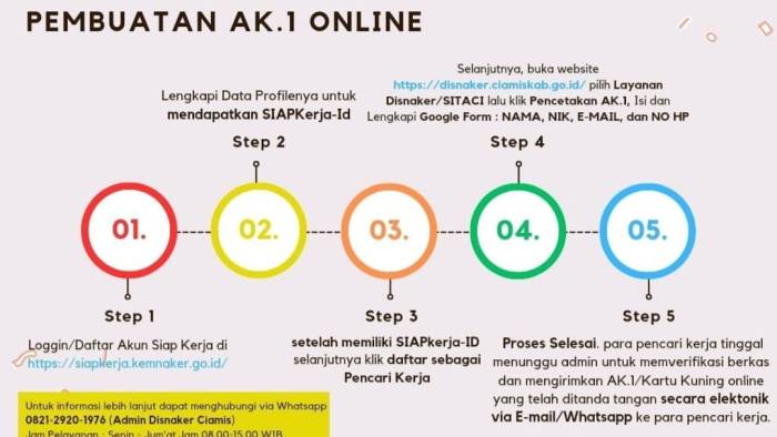 Dengan langkah-langkah, Login atau daftar akun melalui situs resmi SIAPKerja, Lengkapi data profil hingga mendapatkan SIAPKerja-ID, Daftarkan diri sebagai pencari kerja dalam sistem ,Akses website Disnaker Ciamis untuk layanan pencetakan AK.1, Isi formulir online (Google Form) dengan data lengkap seperti NIK, nama, email, dan nomor HP.